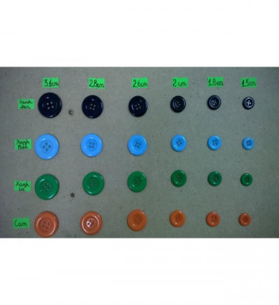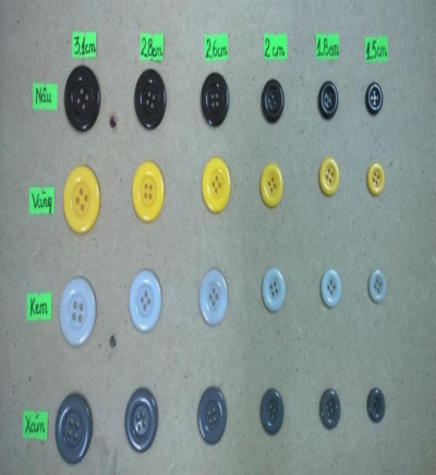 Mình bán nút 4 lỗ gồm rất nhiều size. 15mm, 18mm may quần tây. 20mm may quần kaki. 26mm may áo vét. 28mm, 31mm may áo dạ..