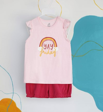 - Thiết kế bộ quần áo ba lỗ với kiểu áo may nhún ở vai, mang đến sự điệu đà cho bé gái mà luôn làm bé thoải mái khi diện vào tiết trời mùa hè oi bức.