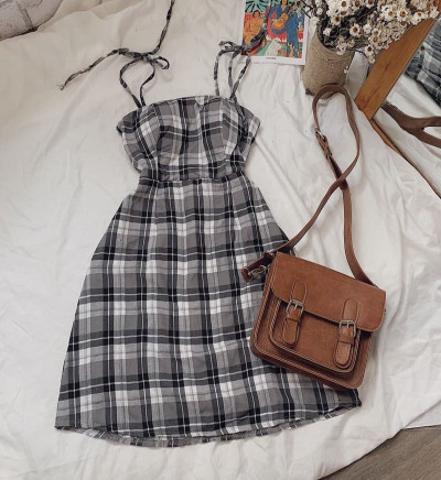 Váy 2 Dây Kẻ Caro Buộc Nơ Lưng Điều Chỉnh Được Dây Áo