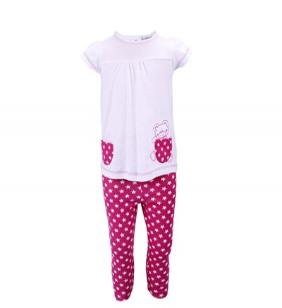 Chất liệu thun cotton với đặc tính co giãn tối đa, hút ẩm tốt, bé có thể tha hồ vận động thoải mái mà không sợ bị nóng, bị hầm bí mồ hôi. Kiểu áo trắng với đườn may nhúm điệu đà, túi gấu tạo điểm nhất kết hợp quần ngố màu hồng họa tiết sao, càng làm tăng thêm nét tinh nghịch, đáng yêu của trẻ.