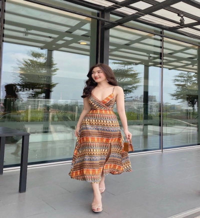 áy đầm maxi thổ cẩm hở lưng xẻ tà thắt nơ eo siêu xinh siêu sang mang đi biển đi du lịch