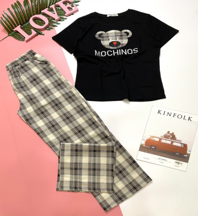 Đồ bộ áo thun thêu gấu quần sọc caro ống suông