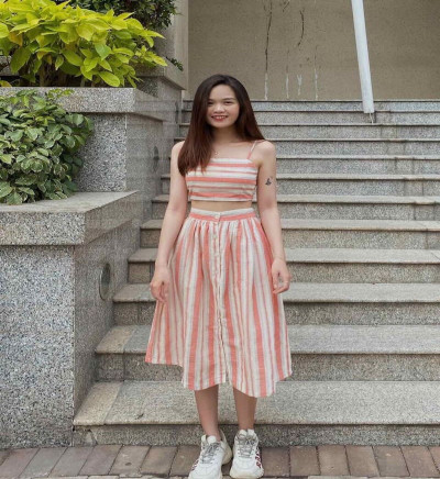 • Bộ trang phục bao gồm 1 áo 2 dây chất đũi lụa kèm chân váy chữ a vải kaki
