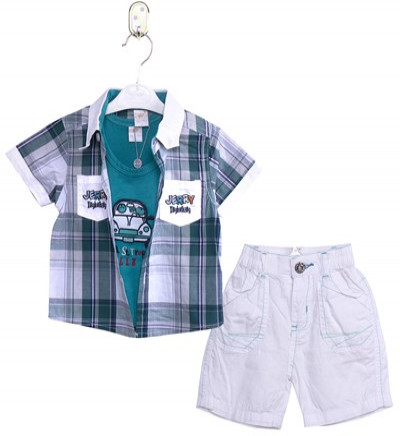 1 sét gồm có: 1 áo sơ mi caro, 1 áo phông sát nách và 1 quần sooc cho bé.