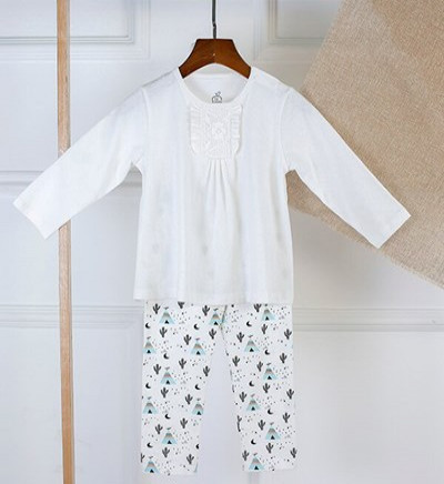 - Phần ngực áo may nhúm với gam màu trắng kết hợp với quần họa tiết nên bé có thể mặc đi chơi, ở nhà đều rất phù hợp
