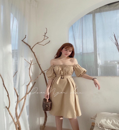 0 đánh giá bỏ buôn đầm midi nude bệt vai thắt eo cực chanh xả