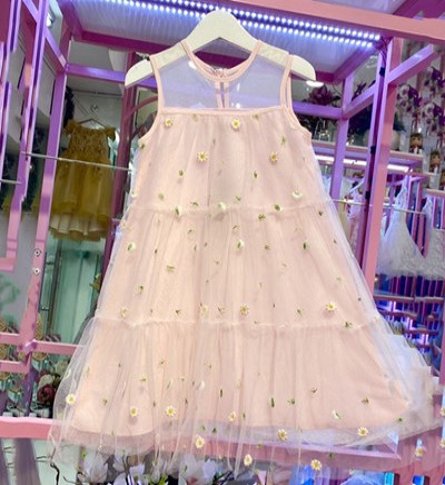 Đầm voan thêu hoa cúc họa mi nổi màu hồng dễ thương cho bé gái