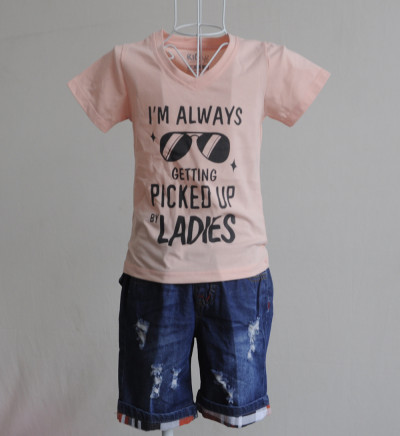 KST107 - KidSet Áo thun cổ tim màu hồng cam in chữ và quần Jean short lưng bo là bộ sản phẩm gồm