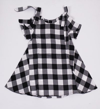 - Họa tiết caro kết hợp gam màu trắng đen, cùng nơ vai tạo điểm nhấn cho thiết kế