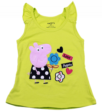 Chú heo peppa là nhân vật hoạt hình ngộ nghĩnh được các bé cực yêu thích qua những thước phim ngắn mang tính hài hước, giáo dục. Mẹ hãy dành tặng cho bé gái bộ quần áo bé gái Carter in hình chú heo peppa với nhiều màu sắc và thiết kế tiện dụng. Sản phẩm được may từ chất vải cotton, mềm mại, thấm hút mồ hôi, kiểu sát nách thích hợp cho bé mặc vào mùa hè nóng bức.
