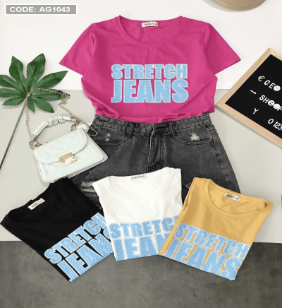 0 đánh giá bỏ sỉ áo thun nữ cổ tròn in chữ Jeans tay ngắn