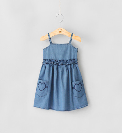 DG230701 - Đầm jean 2 dây thêu túi trái tim 2 bên. Size 1-8Size 9-13
