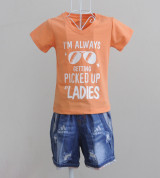 KST105 - KidSet Áo thun cổ tim màu cam cà rốt in chữ và quần Jean short lưng bo là bộ sản phẩm gồm