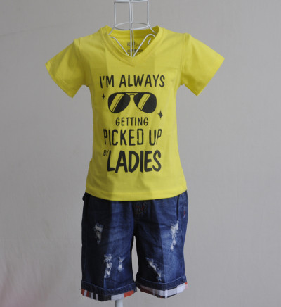 KST110 - KidSet Áo thun cổ tim màu vàng in chữ và quần Jean short lưng bo là bộ sản phẩm gồm