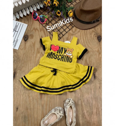 BG100701 - Sumikid chào set chân váy Moschino xinh yêu cho bé diện hè- Nguyên set may bằng chất thun cotton 4c mềm mịn, áo may cách điệu hở vai. Chân váy may rã đô đính dây rút nơ xươnh cá, tùng tròn xoè 360 độ, lai chạy sọc- Có 5 màu như hình- Size 1-8 R8 - Size 9-14 R6