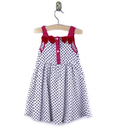 - Váy bé gái thô hai dây sát nách, chấm bi, đính nơ ngực trái.