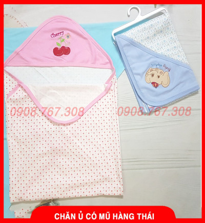 Chăn Mũ Thái Sơ Sinh, Chăn Choàng Trùm Đầu Tiện Lợi Chăn được làm bằng chất liệu vải cotton cao cấp, mềm mại, thấm hút mồ hôi tốt giúp bé yêu luôn cảm thấy thoải mái khi sử dụng Chăn ủ bền đẹp, không xù lông, dễ dàng giặt sạch và nhanh khô. Thiết kế tiện dụng- Chăn mũ Thái cho bé được thiết kế mũ liền giúp che kín và bảo vệ phần thóp của bé khỏi gió mỗi khi tắm xong hay đi ra ngoài.- Thiết kế gọn nhẹ, giữ ấm cho bé. Dễ dàng mang theo ra ngoài khi mẹ cho bé đi chơi xa.- Đường chỉ viền chăn được cắt may tỉ mỉ, không có chỉ thừa, gây cộm ngứa, khó chịu cho bé.- Chăn có màu sắc nhẹ nhàng nhưng vẫn luôn cuốn. Bé yêu sẽ rất thích thú khi được sở hữu chăn có họa tiết đáng yêu và ngộ nghĩnh như thế này.- Họa tiết xinh giắn giúp bé yêu của mẹ càng thêm đáng yêu hơn khi sử dụng.- Sản phẩm có thiết kế móc treo tiện dụng giúp mẹ dễ dàng treo gọn chăn khi không sử dụng- Họa tiết ngộ nghĩnh, đáng yêu- Chăn có màu sắc tươi sáng, nhẹ nhàng kết hợp với những họa tiết là hình thêu các con vật đáng yêu tạo cho bé sự thu hút và thích thú khi được sở hữu chiếc chăn xinh xắn này.- Sản phẩm có nhiều màu sắc và họa tiết khác nhau cho mẹ chọn lựa. Kích thước: 86cm x 91cm