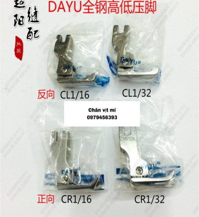 Chân vịt mí dùng để may các đường mí nghịch Là sản phẩm chính hãng của Dayu Sử dụng cho tất cả các dòng máy may công nghiệp 1 kim: Juki, Brother.... Hiện có 4 cỡ: Mí nghịch 1mm - L1/32 Mí nghịch 2mm - L1/16 Mí nghịch 3mm - L1/8 Mí nghịch 5mm - L3/16