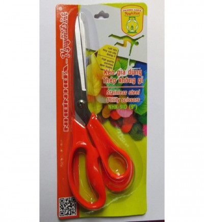 Kéo cắt gia dụng thương hiệu nổi tiếng Nguyễn Đình được người tiêu dùng bình chọn hàng Việt Nam chất lượng cao, kéo làm bằng thép không gỉ, kéo dùng cắt vải, cắt giấy, cắt các đồ gia dụng khác, kéo dài 9inch tương đương 23cm, giá 69k/cái