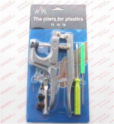 Bộ kìm bấm cúc loại mới với nhiều dụng cụ để bấm cúc nhựa: T3,T5,T8 Cúc bấm nhựa có rất nhiều ứng dụng trên các sản phẩm may mặc: bấm quần, áo sơ mi, áo mưa, vỏ chăn, gối, bấm để mở quai giày, dép thay cho nhám dính vì cúc nhựa bền hơn và dễ sử dụng hơn rất nhiều Bộ sản phẩm gồm có: 1 kìm bấm cúc 2 trụ để kẹp cúc (1 trụ lắp sẵn vào kìm và 1 trụ dự phòng thay thế) 3 đế để dập 3 loại cúc (T3,T5,T8) (1 đế T5 được lắp sẵn vào kìm, 2 đế T3, T8 để ngoài thay thế) 2 miếng cao su trong, dẻo lắp vào trụ kẹp để dự phòng 1 tua vít để vặn ốc trên kìm 1 dùi lỗ