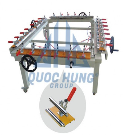 Công ty chúng tôi chuyên cung cấp máy căng khung với cơ cấu kẹp bằng tay, kéo căng khung lụa bằng tay quay bánh xích và nâng khung bằng khí nén.