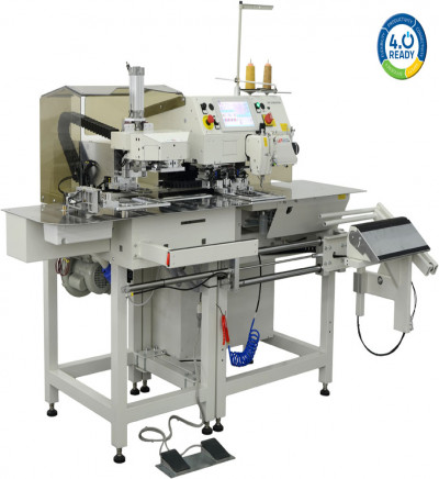 Máy may túi quần jean tự động JAM được sản xuất 100% tại Italia là dòng máy dán túi hoàn toàn tự động từ công đoạn gấp ủi tới may thành túi.
