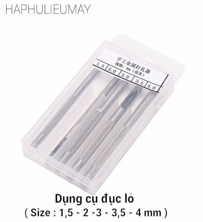 bộ đục lỗ 5 size 1,5 mm 2 mm 3 mm 4 mm Loại tốt đẹp sắc. có hơi ngả màu đen Bên mình có tách lẻ nhé giá 10k /1 que ( lưu ý que lẻ không có hộp ). Chuyên sỉ lẻ phụ liệu may mặc giá tốt.