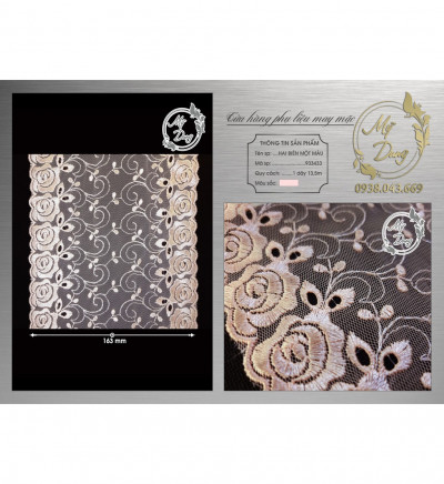 Ren lưới chuyên dùng để may đồ mặc nhà, váy ngủ..v..v Ren được thêu tỉ mỉ, đường nét sắc xảo tạo nên những hoa văn vô cùng đẹp mắt, có thể nói yêu ngay từ cái nhìn đầu tiên. Giá bán theo từng dây. Quy cách đóng gói 1 dây dài 13.5m (khổ ngang tùy loại) Màu sắc: Có trên 40 màu khác nhau theo bảng màu đính kèm.